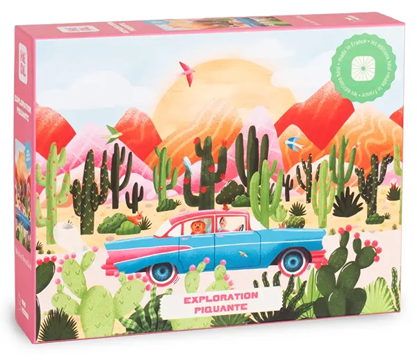 Heol Spicy Exploration palapeli 1000 palaa. Kuvassa jenkkiauto matkaa meksikotyylisessä maisemassa, jossa kaktukset ovat korkeammat kuin auto ja vuoret siintävät taustalla.