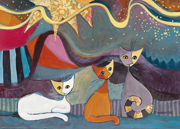 Rosina Wachtmeister Keltainen nauha palapeli (Yellow Ribbon) on Heyen 1000-palainen. Itävaltalainen taiteilija Rosina Wachtmeister tunnetaan etenkin kissapalapelien kuvituksista. Kuvassa kolme kissaa istuskelevat, taivaalla leiskuu aurinko ja keltainen nauha.