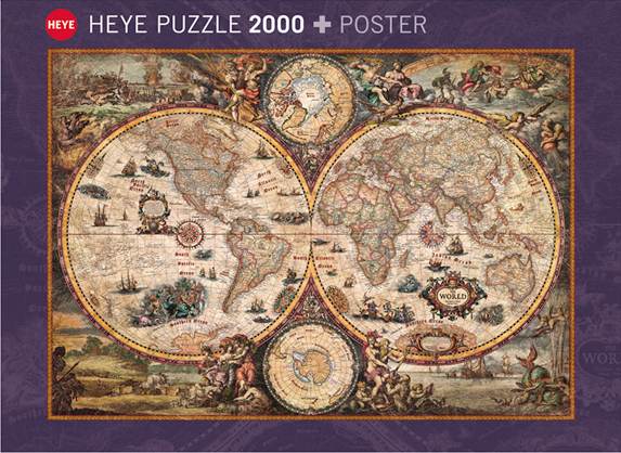 Heye Vintage World palapeli 2000 palaa on karttapalapeli, jossa vanha maailmankartta. Rajko Zigic’n kuvittamassa karttapalapelissä karttaa koristaa klassiseen tyyliin tehdyt kuvitukset. Pohjois- ja etelänapa on kuvattu omina pyöreinä karttoina. Innostu ja tutustu menneiden vuosisatojen karttaan tässä 2000 palan palapelissä, jonka kokoamista helpottaa runsaat yksityiskohdat.