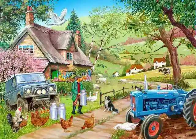 Tässä 500 palan palapelissä mies kantaa maitotonkkaa. Traktori ja Jeep näkyy pihalla. Tässä maatilapalapelissä on nostalginen tunnelma ja paljon yksityiskohtia, jotka helpottavat palapelin kokoamista.