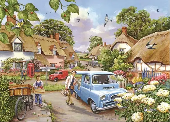 Tämä 500 palan palapeli vie brittiläisen kylän aamuun, jossa kuski tuo maitopulloja.