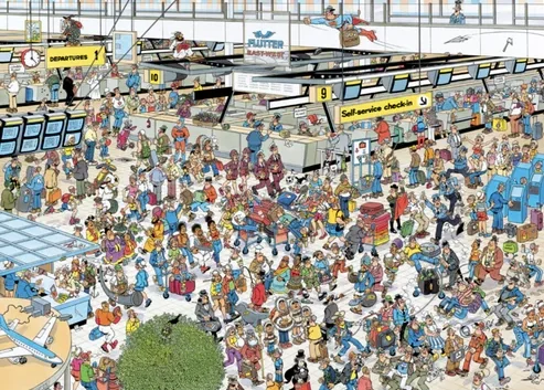 Jan van Haasteren Departure Hall -palapeli 1000 palaa on Haasterenin lentoasema-aiheinen palapeli. 1000 palan palapelissä sattuu ja tapahtuu vaikka mitä ja ihmisiä riittää.