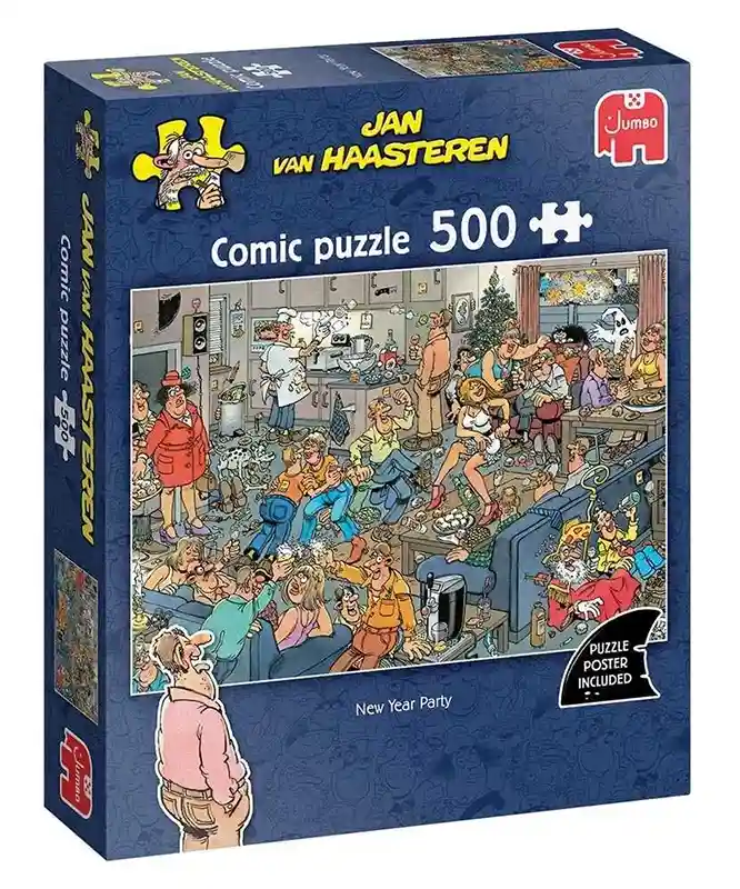Jan van Haasteren New Year Party on 500 palan palapeli, jossa juhlitaan uutta vuotta. Ja kas, juhlissa sattuu ja tapahtuu Jan van Haasteren tapaan sitä sun tätä.
