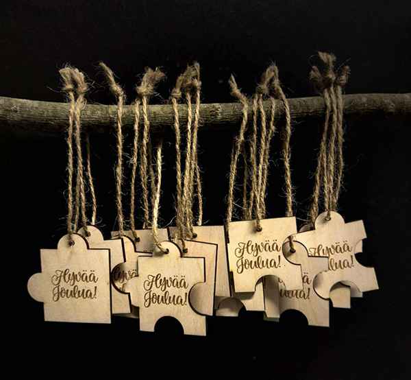 Joulukoriste palapelin palan mallinen on uniikki käsityönä tehty koriste, jonka voit ripustaa vaikka kuuseen tai laittaa paketin päälle koristeeksi. Joulukoriste on puuta ja se on kevyt. Koristeen koko on noin 5 x 5 cm. Joulukoriste palapelin palan mallinen