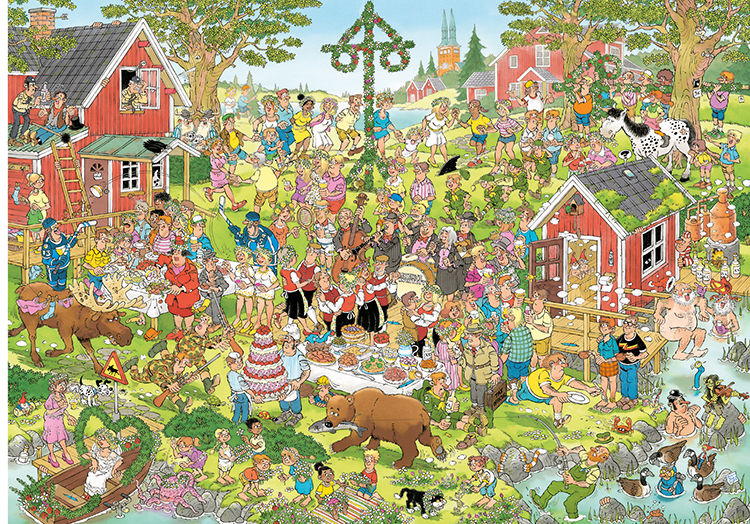 Jan van Haasteren juhannus palapeli (Midsumemr festival), jossa vietetään keskikesän juhlaa. Juhannussalko ja jopa Peppi Pitkätossun hevonen löytyy näistä juhannusjuhlista.