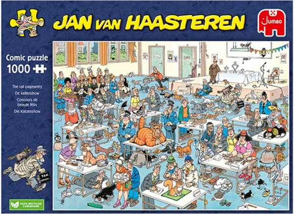 Jan van Haasteren Kissanäyttely (The cat pageantry) -palapelissä sattuu ja tapahtuu vaikka mitä. Palapelissä on 1000 palaa.