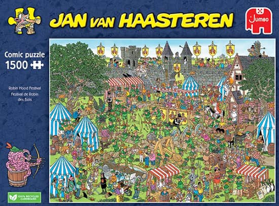 Jan van Haasteren Robin Hood Festival palapeli on Jumbon kevään 2024 uutuus, jossa on 1500 palaa. Robin Hood juhlat on järjestetty linnan läheisyydessä. Nurmikentän täyttää tapahtumateltat ja väkeä riittää.