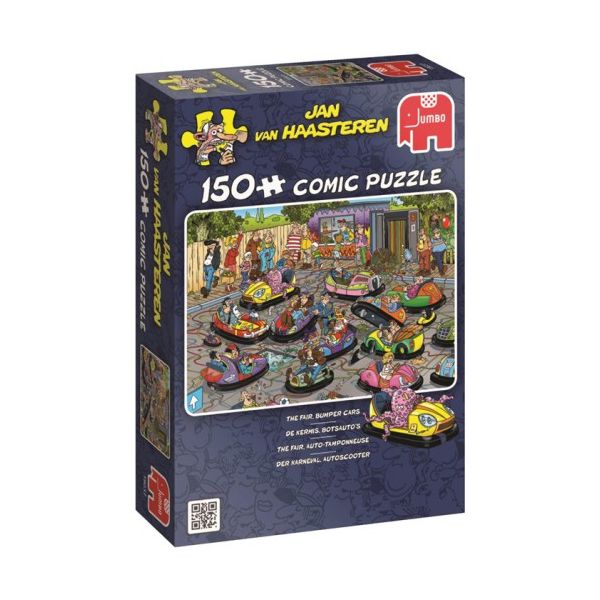 Jan van Haasteren Törmäysautot palapeli on 150 palan palapeli, jossa riittää hauskuutta ja pieniä yksityiskohtia. Törmäysautojen palat ovat normaalia suuremmat, joten niitä on helpompi käsitellä.