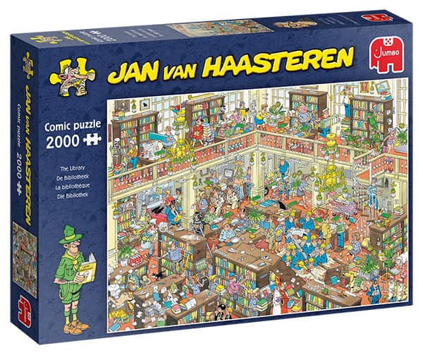 Jan van Haasteren Kirjastossa palapeli (The Library) 2000 palaa. Mitä kaikkea kirjastossa tapahtuukaan! Kun kokoat tätä palapeliä, löydät pieniä hauskoja yksityiskohtia, joita et kannen kuvasta ole huomannutkaan.