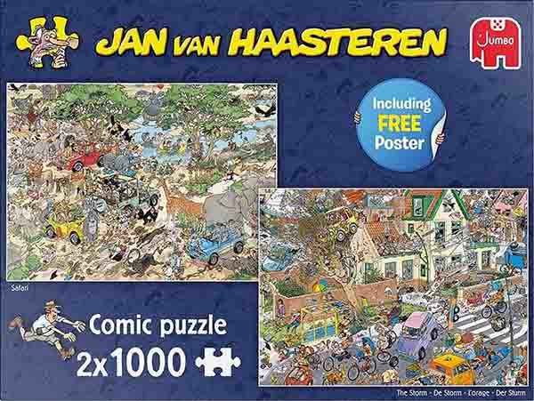 Jan van Haasteren Safari & Storm palapelit 2×1000 palaa multipakkaus. Toisessa palapelissä seikkaillaan safarilla, toisessa myrskyää.