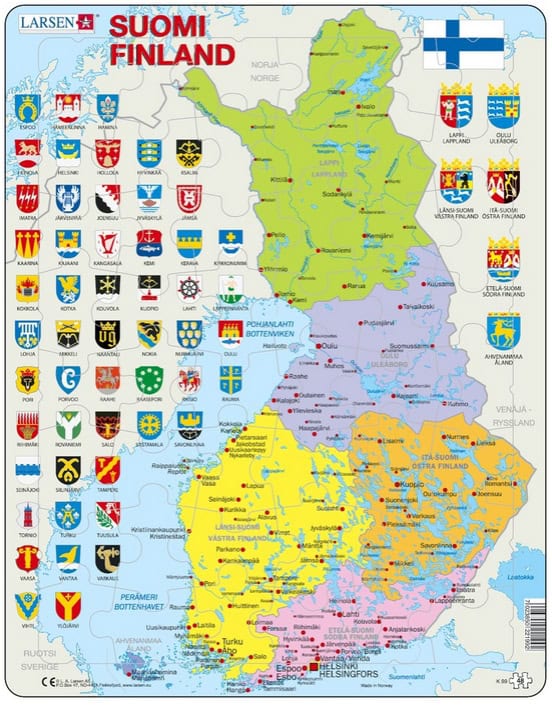 Kehyspalapeli, jonka aiheena on Suomi ja Suomen vaakunat. Paikkakunnat lukee suomeksi. Palapelissä on 48palaa.