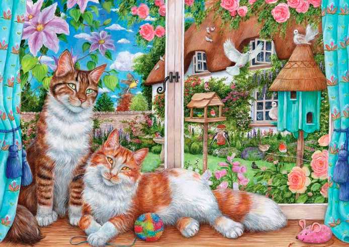 Rentoudu kissojen seurassa kiireettömän iltapäivän tunnelmissa! Falcon de luxe: Lazy Afternoon on 1000 palan palapeli, jossa kaksi kissaa nauttii ikkunalaudalla rauhallisesta hetkestä. Ikkunasta näkyy kodikas puutarha.
