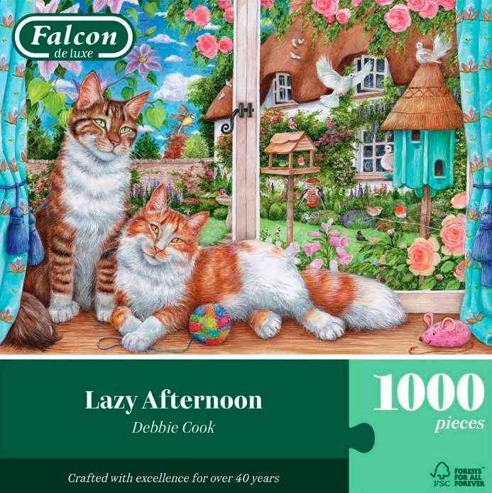 Kuvittaja Debbie Cook tunnetaan lempeistä eläinaiheistaan, ja tässä palapelissä hänen taiteensa tuo esiin kissojen rauhallisen olemuksen ja ympäristön vehreyden. Falconin de luxe -sarja takaa laadukkaat palat ja nautinnollisen kokoamiskokemuksen.