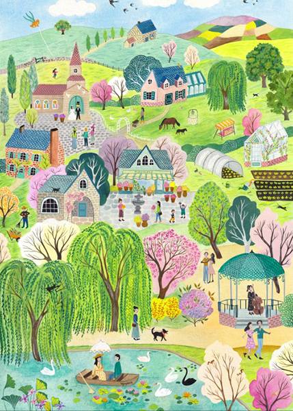 Les Beaux Jours palapeli 1500 palaa eli Kauniit päivät palapeli 1500 palaa on ranskalaisen Pieces & Piecen valmistama maisemapalapeli. Kylän talot on rakennettu lammen läheisyyteen. Lammella pariskunta istuu veneessä, nainen ulkoiluttaa koiraa ja mies haravoi. Puut vihertävät ja kukkivat rosan eri sävyissä.