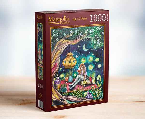 Magnolia Boho Vibes palapeli 1000 palaa on tunnelmallinen kuva tytöstä, joka nauttii mitä ilmeisemmin höyryävää iltateetä. Hän lukee kirjaa kynttilänvalossa ja tulikärpästen valossa.