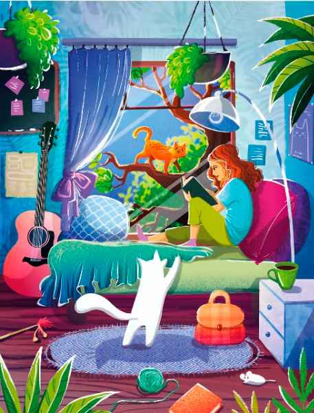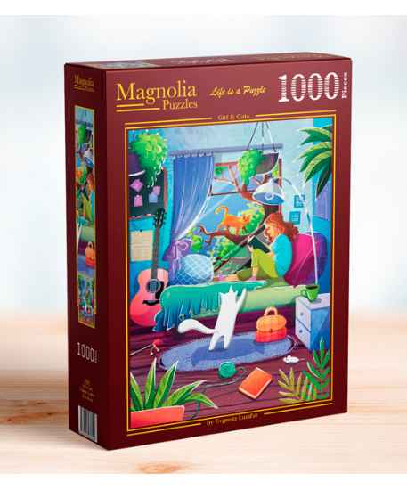 Magnolia Girl & Cats palapeli 1000 palaa on näkymä naisen huoneeseen, jossa hän lukee. Kissat norkoovat ympärillä.
