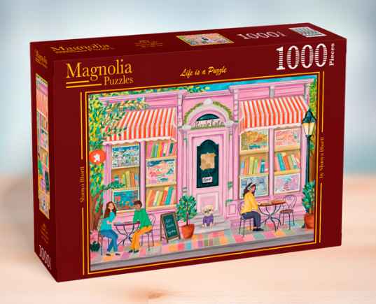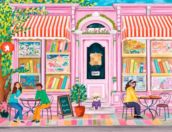 Magnolia Puzzle Cafe palapeli 1000 palaa. Palapelikahvilan edessä kootaan palapeliä ja vietetään leppoisaa aikaa.