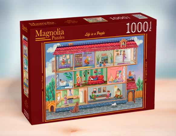 Magnolia Sweet home palapeli 1000 palaa on poikkileikkaus talosta, jonka jokaisessa huoneessa asukkaat elävät omaa kotielämäänsä. Yksi kylpee, toinen kokkaa, kolmas joogaa ja viides soittaa kitaraa. Parvekkeella nainen maalaa taulua.