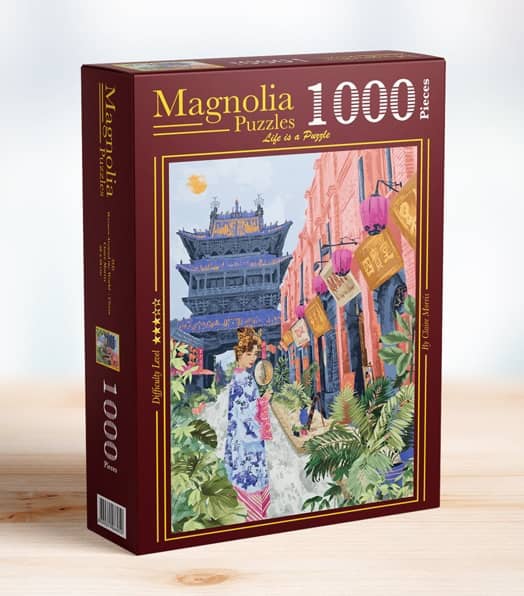 Magnolia palapeli Naisia ympäri maailman Kiina on 1000 palan palapeli, jos kiinalainen nainen pitää viuhkaa kädessään. Upea vanha rakennus piirtyy taustalla. Myös rehevät kasvit tuovat väriä ja elementtejä, jotka helpottavat kokoamista. Tämä on upea matka kiinalaiseen kulttuuriin ja värimaailmaan. Kuvittajana Claire Morris.