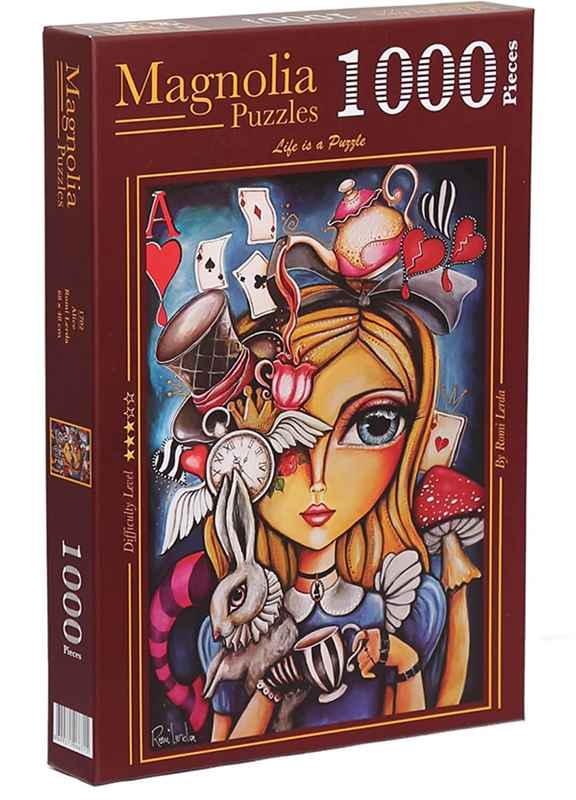 Magnolia Alice palapeli 1000 palaa on Romi Lerdan kuvittama Liisa Ihmemaassa -aiheinen palapeli. Liisa pitää kania kainalossaan, silmää peittää siivekäs kello ja kahvikannu lorottaa kahvia kuppiin.