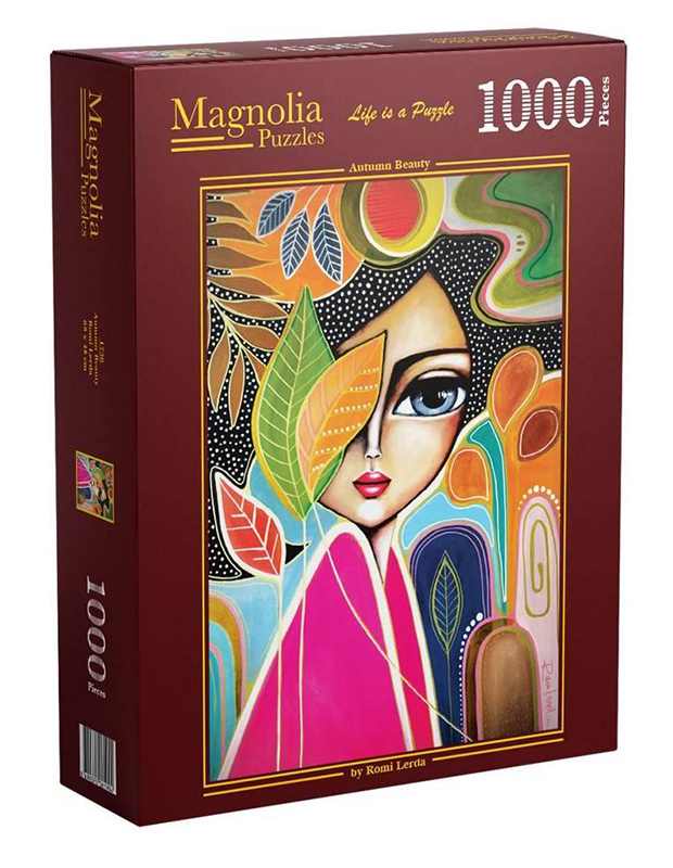 Magnolia Autumn Beauty palapeli 1000 palaa on Romi Lerdan kuva tytöstä, jolla syksyisten kasvien lehdet samassa kuvassa.