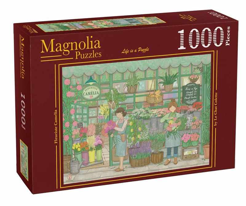 Magnolia Fleuriste Camelia palapeli 1000 palaa on Le Chat Coletten kuvittama kukkakauppias-palapeli. Floristit tekevät kukkakimppuja Kukkakauppa Cameliassa.