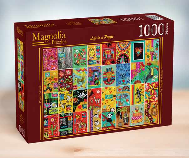 Magnolia Popart Mosaic palapeli 1000 palaa on Magali Modouxin kuvittama kollaasipalapeli, jonka kuvassa 32 arfikkalaistyylisesti kuvioitua ruutua. Tämä 1000 palan palapeli on värikäs ja sen voit koota vaikka ruutu kerrallaan.