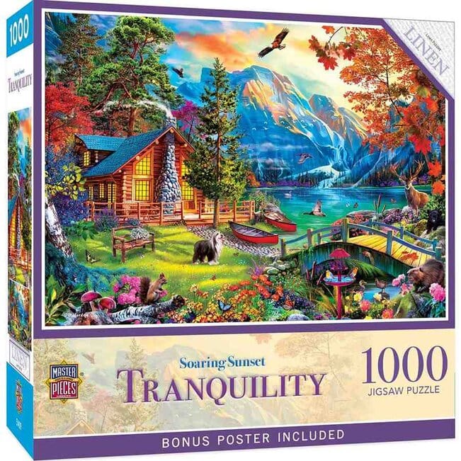 Soaring Sunset palapeli 1000 palaa on MasterPieces-palapelimerkin mökki-aiheinen palapeli. Villieläimet viihtyvät mökin lähettyvillä vaikka koira seisoo pihalla. Kanootit on jätetty rantaan ja piha on rauhoittunut. Vuoret ja turkoosi vesi välittävät luonnonrauhaa myös palapelin kokoajalle.