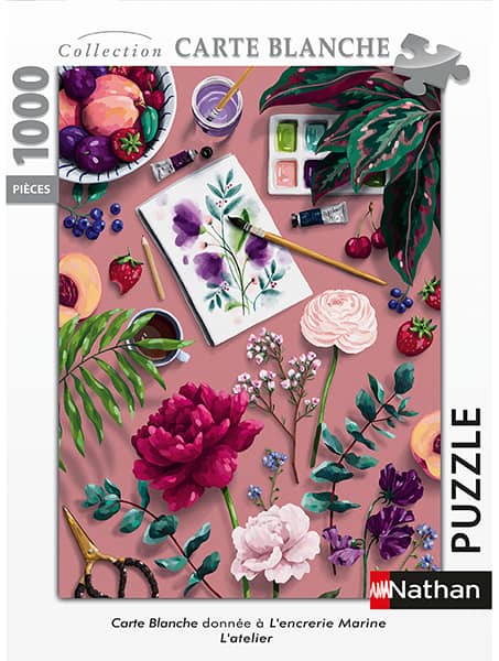 Taiteilijan työpöytä palapeli on Nathanin 1000 palan palapeli. Pöydällä taiteilijan sivellin odottaa maalaajaa. Mallina pionit marjat ja kasvit.