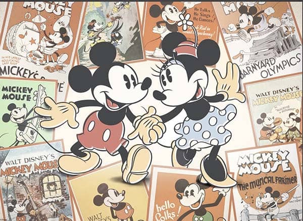 Mikki Hiiri ja Minni kävelevät käsi kädessä. Taustalla vanhoja Mikki Hiiri -julisteita.