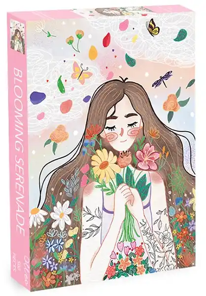Olleo Blooming Serenade -palapeli 500 palaa on FNY:n kuvitus kukkia kädessään pitävästä tytöstä.