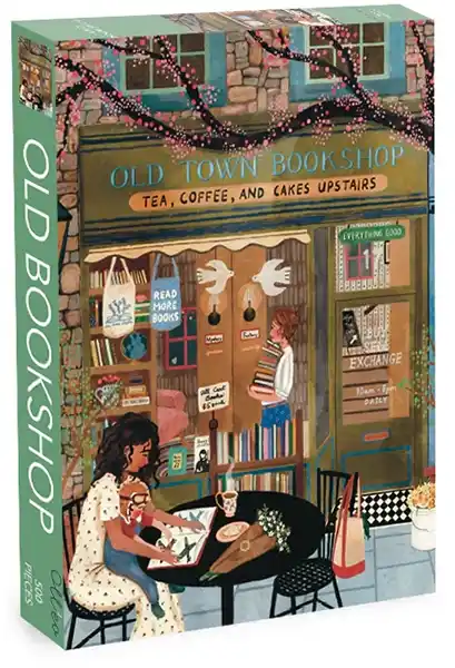Olleo Old Bookshop -palapeli 500 palaa on Elisabeth Dorrian kuva vanhasta kirjakaupasta. Nainen katselee kuvakirjaa lapsi sylissään. Nainen kantaa kirjopinoa. Tunnelmallinen vanha kaupungin kirjakauppa, josta saa myös teetä ja kahvia.