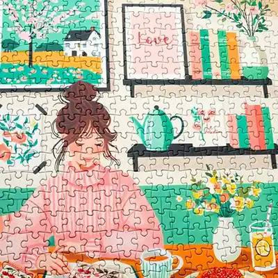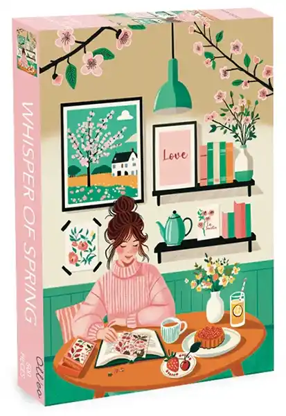 Olleo Whisper of Spring -palapeli 500 palaa on AvecJoyJethenen kuvitus kirjaa lukevasta naisesta. Keväiset kukat piristävät sekä tauluissa että kukkamaljakossa.