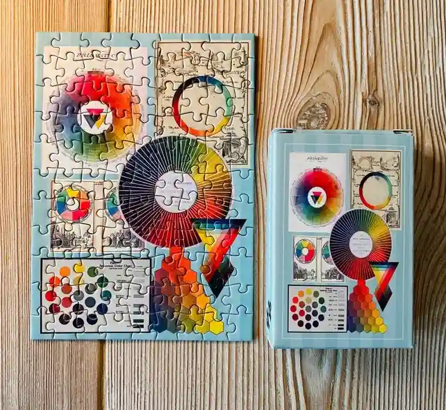 Minipalapeli, jossa on kauniita vintage-kuvituksia väriteoriasta, värien sekoittamisesta ja kauniista geometrisista muodoista.