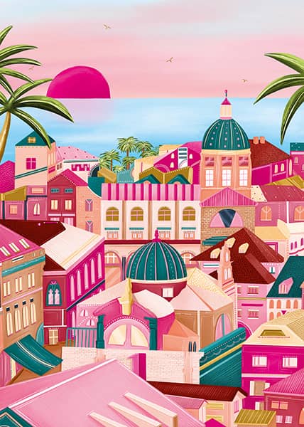 Rakennusten muodot ja taivaan eri sävyt auttavat palapelin tekemisessä. Nauti ihanista väreistä.