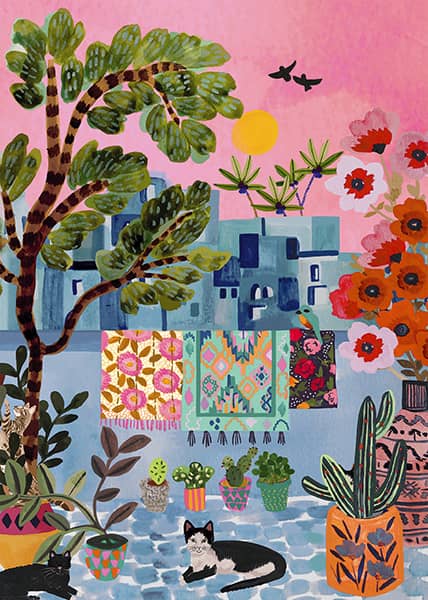 Chefchaouen kissat palapeli 1000 palaa on Pieces & Peacen valmistama. Kuvassa marokkolainen kaupunki Chefchaouen, kaupungin kissat, värikkäät matot ja laatikkomaiset talot. Kuvittajana Hebe Studio.