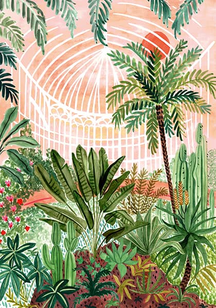 Victorian kasvihuone palapeli 1000 palaa on Pieces & Peacen valmistama. Midnight To 6 kuvittamassa kuvassa palmut, kaktukset ja mehikasvit kukoistavat isossa kasvihuoneessa.
