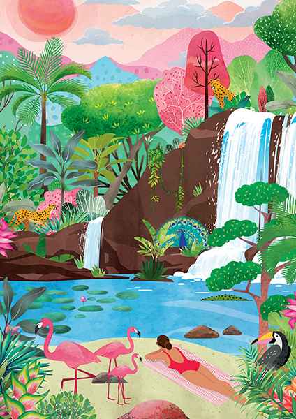 Tropical Vibes palapeli 500 palaa on Heln.illustration kuvittama tropiikin lämpöä hehkuva kuvitus. Nainen nauttii auringosta, flamingot ja tukaani katsovat vierestä, vesiputous tuo värikkäälle maisemalle vastapainoa.