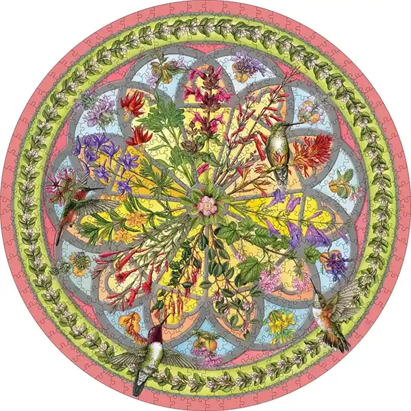 Tämän kukat ja linnut -aiheisen palapelin on valmistanut Pomegranate, joka on tunnettu korkealaatuisista taidepalapeleistä. Palat on painettu semi-mattapintaiselle, paksulle taidepaperille, joka toistaa värit kirkkaasti ilman heijastuksia. Pyöreä muoto tuo kokoamiseen oman haasteensa ja erottaa tämän palapelin perinteisistä suorakulmaisista malleista. Mukana on kuvaliite kokoamisen tueksi.