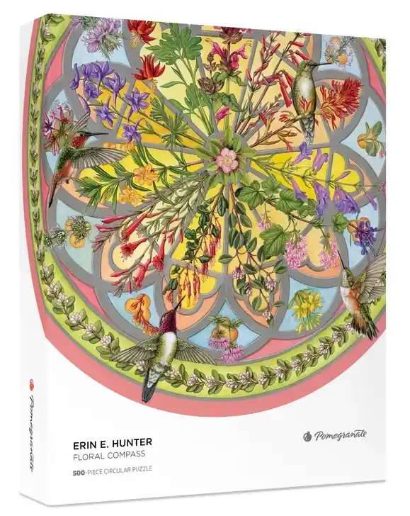 Floral Compass palapeli on 500 palan pyöreä taidepalapeli, joka perustuu kuvittaja ja tieteelliseen kuvitukseen erikoistuneen Erin E. Hunterin teokseen.