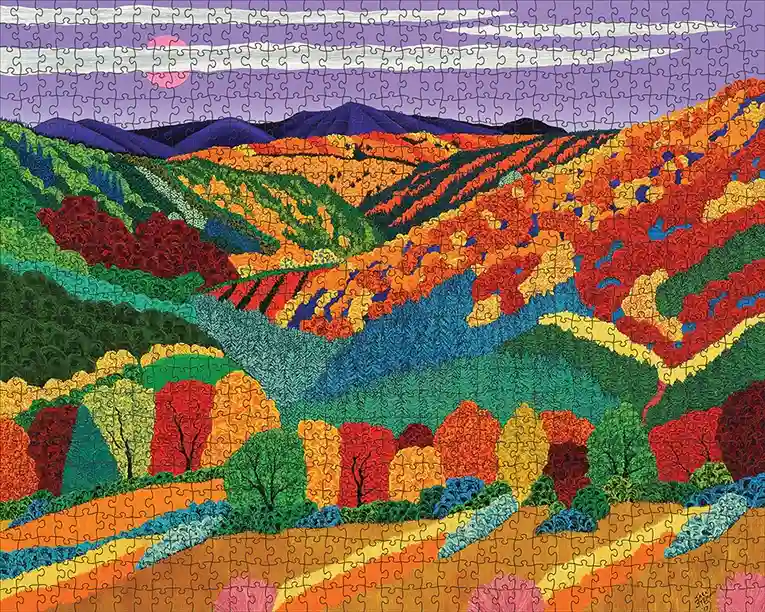 Tässä 1000 palan aikuisten palapelissä maisema hehkuu vihreän, oranssin, turkoosin, lilan ja sinisen eri sävyissä. Jos tykkäät palojen lajittelusta, tämän värikkään maiseman palat voit lajitella värien mukaan.