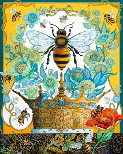 Tässä 1000 palan mehiläiset-palapeli on taideteos luonnon tärkeille pölyttäjille. Keskiössä on mehiläinen, jota taiteilija esittelee kuin kuningatarta, kukkien keskellä kruunun päällä. Pienemmät mehiläiset touhuavat kukkien parissa.