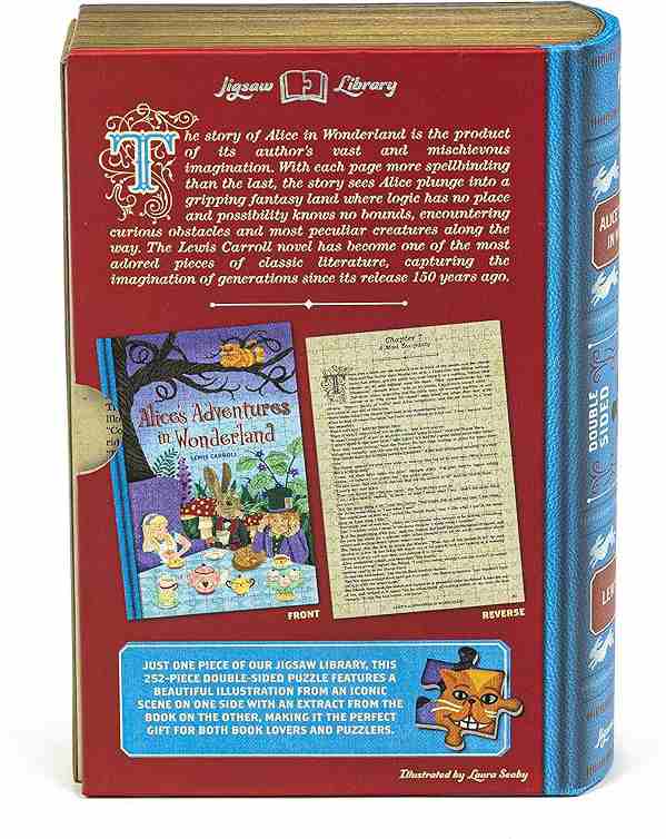 Professor Puzzle Alice in Wonderland palapeli 252 palaa on pakattu kirjan malliseen rasiaan. Kirjapalapeli Liisa Ihmemaassa on kaksipuoleinen palapeli; toinen puoli on on kirjan kuvitusta ja toinen puoli on tekstiä kirjasta.