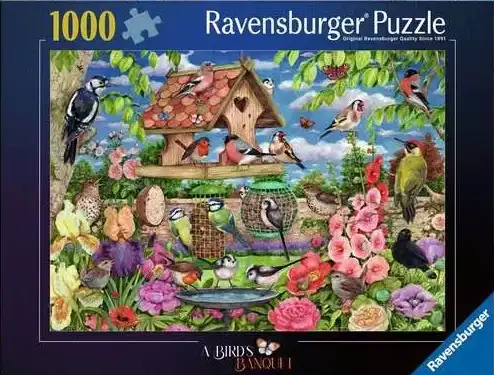 The Bird’s Banquet palapeli 1000 palaa on Ravensburgerin tammikuun 2026 uutuus lintupalapeli! Tämä 1000 palan palapeli esittelee lintulaudan tuttuja lintuja kuten punatulkun, punarinnan, sinitiaisen, pyrstötiaisen, rastaan ja tikat. Kuvittaja Debbie Cook.