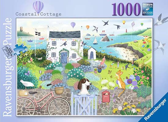 Coastal cottage palapeli on Ravensburgerin 1000 palan palapeli. Kuvassa koira katsoo portin yli ja kissa istuu kiviaidalla. Perhe viettää aikaa pihalla. Veneet ja laiva seilaavat merellä. Kuvittaja Emma Allenin on piirtänyt kuvaan myös paljon kukkia ja kasveja.