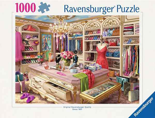 The Coveted Closet palapeli 1000 palaa on Ravensburgerin vuoden 2025 uutuus. Astu ylelliseen vaatehuoneeseen, joka on täynnä tyylikkäitä vaatteita ja asusteita. Upea punainen mekko on aseteltu mallinuken päälle. Kaapin yläpuolella roikkuu häikäisevä kattokruunu, joka lämpimän valon kaapin ylle ja luo elegantin tunnelman.