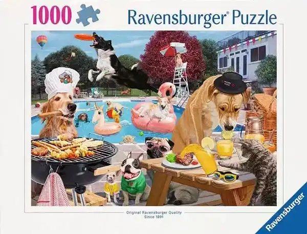Dog days of summer palapeli 1000 palaa on Ravensburgerin huumorintäytteinen kuva uima-altaalta, jossa koirat nauttivat päivästä.