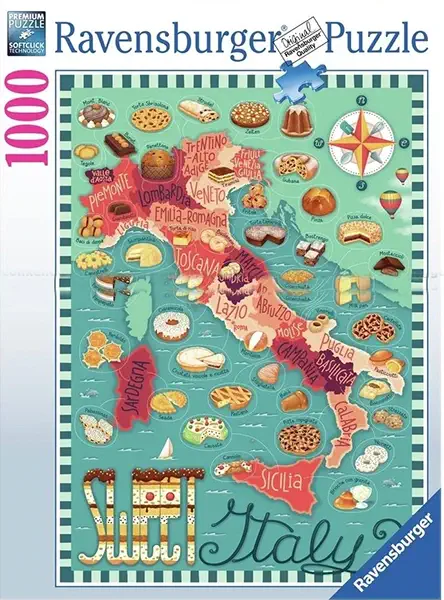 Italian kartta palapeli on Ravensburgerin 1000 palan palapeli. Palapelin kuvassa italialaisia herkkuja on sijoitettu Italian karttaan. Kaikki herkut on nimetty. Kartasta näet, missä mikin Italian maakunta sijaitsee. Löydätkö oman italialaisen lempikakkusi tai muun herkullisen makean?
