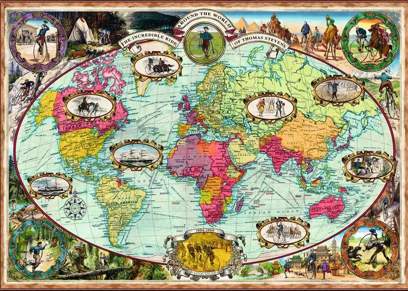 Polkupyörällä maailman ympäri palapeli (Bicycle ride aroud the world) on Ravensburgerin 1000 palan palapeli. Kuvassa kartta, jossa vanhoja kuvia polkupyöristä ja pyöräilijöistä. Kartan ympärillä kulkee kuvitus, jossa vanhoja pyöriä.