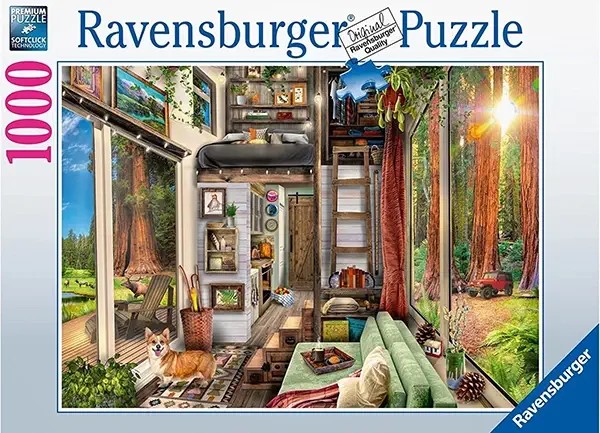 Redwood forest tiny house palapeli on Ravensburgerin 1000 palan palapeli. Kuvassa pieni talo on isojen kalifornialaisten punapuiden keskellä. Gorgi-koira katseleekohti palapelin kokoajaa. Auringonsäteet siivilöityvät puiden lomasta.